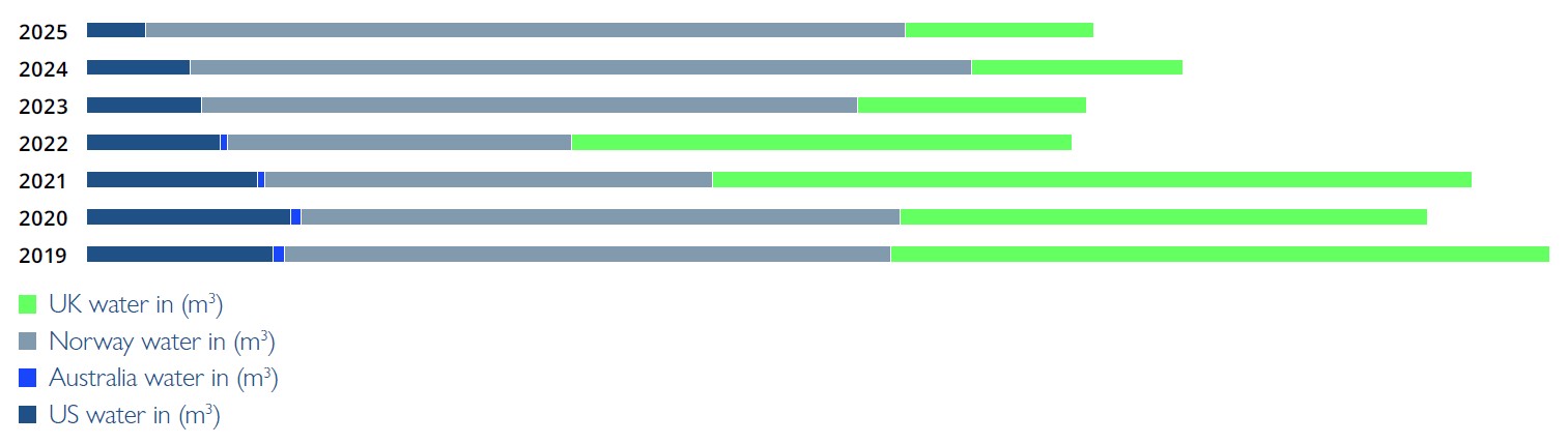 The chart shows our total water consumption across operations in the US, Australia, Norway, and the UK from 2019 to 2025. Over this period, overall water use has declined markedly—from roughly 1.28 million m³ in 2019 to under 880,000 m³ in 2025 demonstrating the continuing impact of our water-reduction initiatives. In the UK, consumption has decreased substantially, with levels falling by more than two-thirds since 2019 as a result of targeted efficiency measures and improvements in facility operations. Norway remains one of our highest-demand regions due to the scale of our activities, and while usage fluctuated year to year, it remains lower than 2019 levels despite operational growth. Australia shows relatively small but consistent variations over time, reflecting local conservation programs and increased water-reuse practices. In the US, water consumption has dropped significantly from more than 160,000 m³ in 2019 to just over 47,000 m³ in 2025 highlighting strong progress in process optimisation and resource efficiency. We remain committed to continuous improvement across all regions, supporting responsible water stewardship and long-term resource resilience.